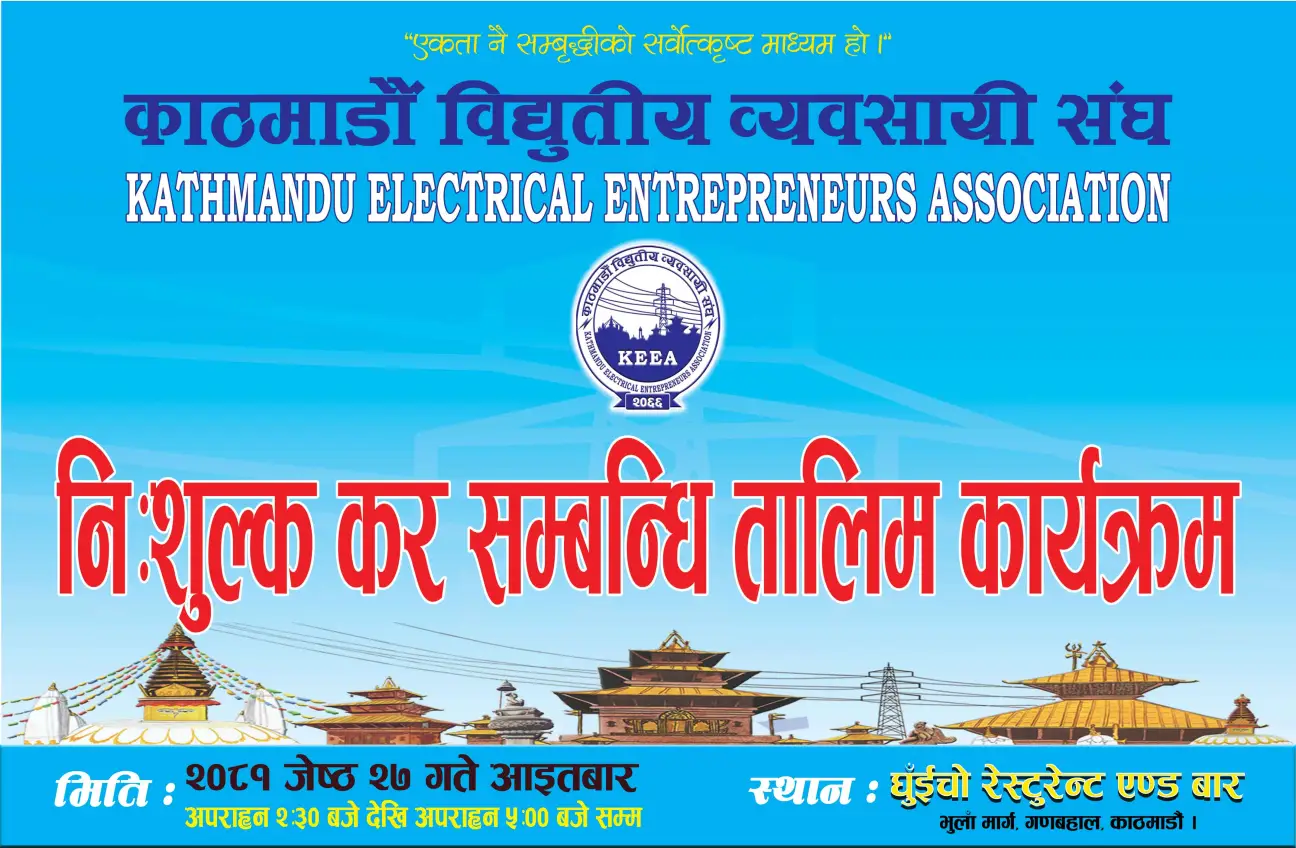 काठमाडौं विद्युतीय व्यवसायी संघमा आबद्ध उद्यमी एवम् व्यापारी÷व्यावसायीहरूका लागि करको दर, आयकर सम्बन्धी नीतिगत कुराहरु तथा मूल्य अभिवृद्धि कर आदीसंग सम्बन्धीत बिषयबस्तु समेटि आन्तरिक राजस्व कार्यालयका सम्बन्धीत विज्ञहरुबाट काठमाडौं विद्युतीय व्यवसायी संघले निम्नलिखित मिति, समय र स्थानमा निःशुल्क आयोजना गर्न लागिएको कर सम्बन्धि प्रशिक्षण कार्यक्रममा सहभागी भई लाभ लिनुहुन हार्दिक अनुरोध गर्दछौं ।